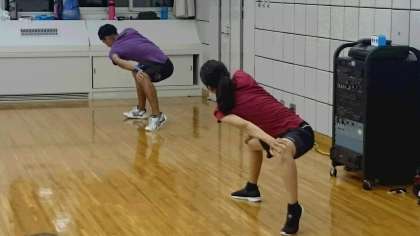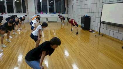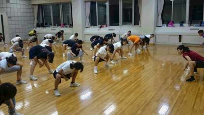 陸上部は昨日に引き続き、ストレッチアンドエアロビクスです。インストラクターは山崎先生です。(副校長)