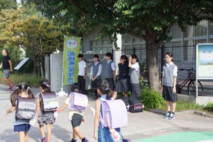 船橋小学校は今日も活気あるあいさつ運動でした。昨日よりやや日差しが弱く、木陰でなくても、昨日ほど暑そうではなさそうでした。