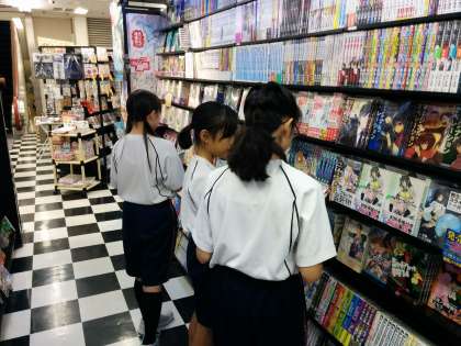 文教堂書店経堂店では生徒3人が本の陳列に四苦八苦しています。