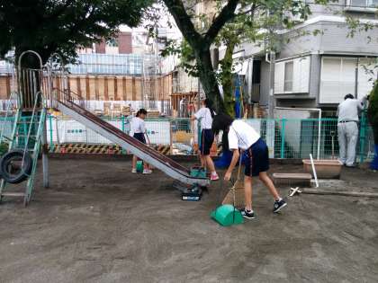 下北沢保育園では3名の生徒たちが園庭の落ち葉はきをしていました。