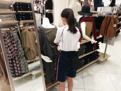 ユニクロ世田谷千歳台店では3人の生徒がマネキンに服を着せていました。