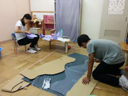 希望ヶ丘保育園では2名の生徒たちが小道具を製作していました。