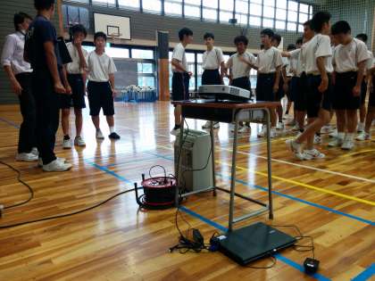 休み時間の移動中に「外で出来るのに」と愚痴をこぼしていた生徒も、体育館に入って並べられたプロジェクターとパソコンを見て納得、ICTを用いてフォームの矯正が行われるのだなと理解していました。