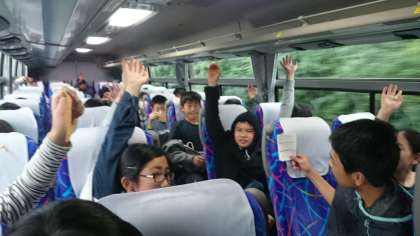 バス内のレクを楽しんでいます。レク係は用意周到です。(副校長)