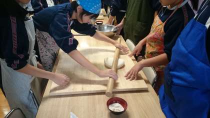 いよいよこねた小麦粉を伸ばし始めました。(副校長)