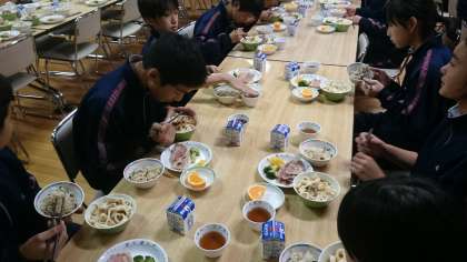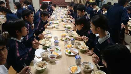 夕食の時間です。山は登れませんでしたが、みんな食欲旺盛です。(副校長)