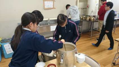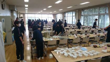 食事係が朝食の準備を頑張っています。この後、7時から朝食です。(副校長)