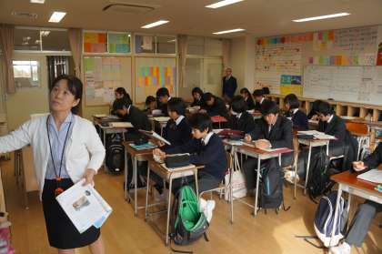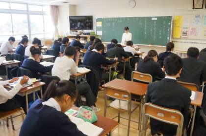 中学校の授業を公開し、船橋希望学舎の小学校の先生方が授業を参観していらっしゃいます。