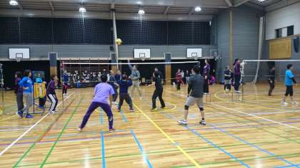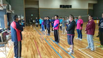 近隣の小中学校のお父さんが集まり、学校対抗のソフトバレーボール大会です。