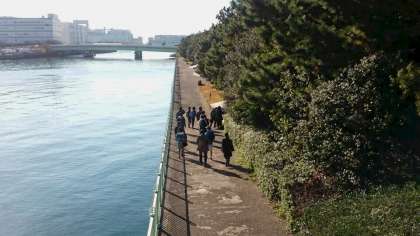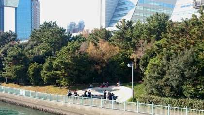 東京ビックサイトの近くでお昼です。とても暖かくて気持ちいいです。(副校長)