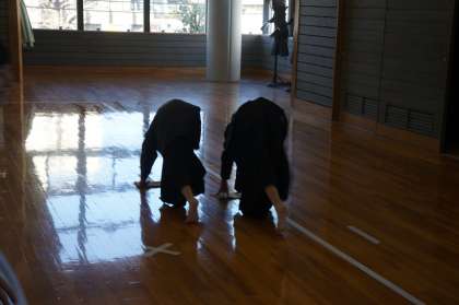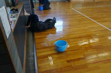 格技室では剣道部がぞうきんがけを行っていますが、速さを競い合った結果とんでもないことになっていました。