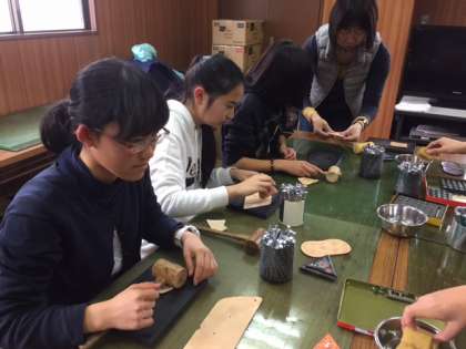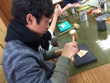 共進エルでは6人の生徒が革小物を作っています。どの模様にしようか説明を聞きながら楽しく、体験をしています。