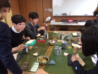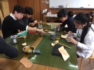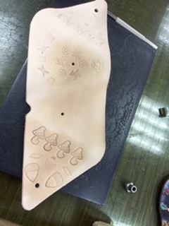 協進エルです。刻印を木槌でたたいて皮に柄をつけています。