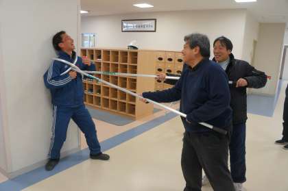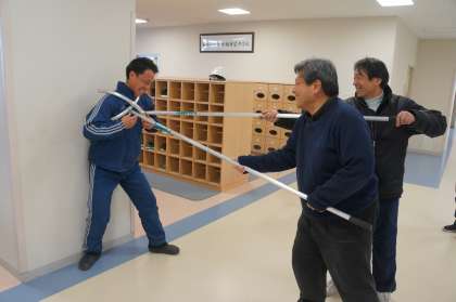 1Fでは授業時間でなかった教員が刺股の訓練を行いました。