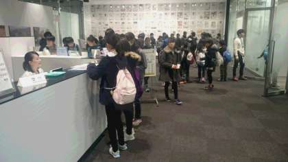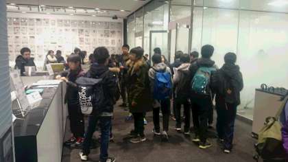 ニュースパークです。生徒たちはこれからレクチャーを受け、その後ワークシートを持って館内を見学します。(副校長)