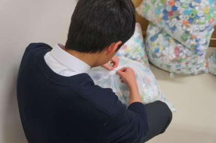他の役員が専門委員会に分散している間に、会長と副会長がペットボトルキャップを業者に回収してもらいやすいようにするために均等に袋に分けています。
