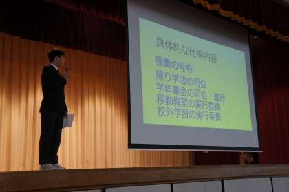 学校行事紹介、生徒会活動紹介、旧1学年学級委員会の説明です。