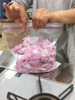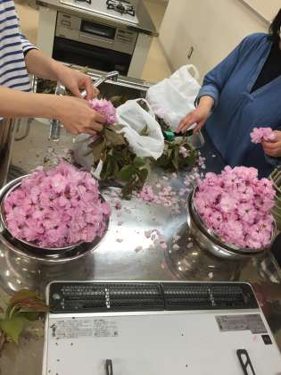 ふなきぼサポートクラブの方々が儀式等の桜茶で使う「桜の塩漬け」づくりを開始しました。約3回に分けての作業のうち、第1回目を行いました。
