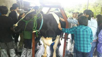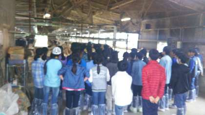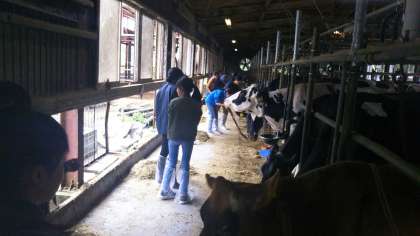 3組と4組の酪農体験の様子です。餌やりや乳絞り体験など貴重な経験をさせてもらっています。(田村真)