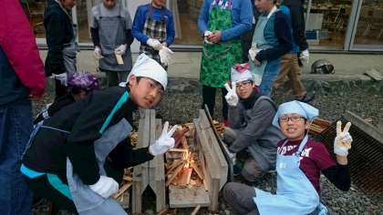 上手に火をつけています。食材の準備も同時進行中です。(副校長)