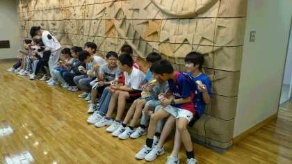 夜食タイムです。レク大会でちょうどお腹がすいてきました。(副校長)
