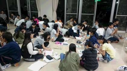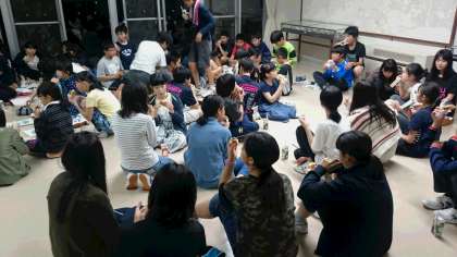 玄関のロビーでも楽しそうに食べています。(副校長)