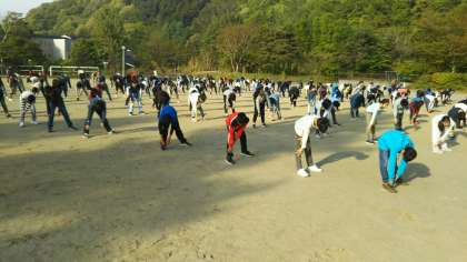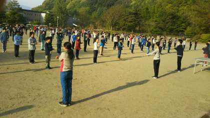 朝礼の様子です。ラジオ体操もきっちり行いましょう。(田村真)