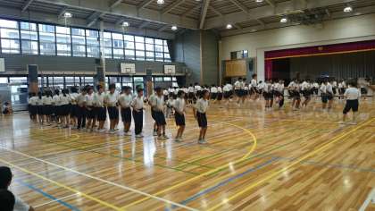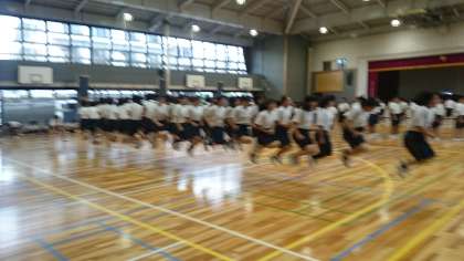 雨のため、体育館で3年生が大縄の練習をしていました。