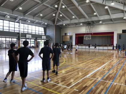 校庭では女子硬式テニス部が、体育館ではバスケ部が練習しています。