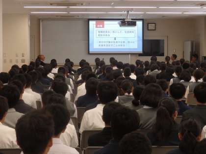 1年生のセーフティー教室の様子です。身近に潜むネット犯罪の危険性、被害者や加害者にならないためにはどうすれば良いかを、専門家の方やビデオを見て学びました。また、本日のセーフティー教室では多くの保護者の方にもご参加いただきありがとうございました。(田村真)