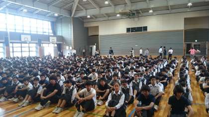 朝礼が始まる5分前には生徒の体育館集合がほぼ完了し、生徒は落ち着いた状況で、朝礼が始まるのを待っていました。