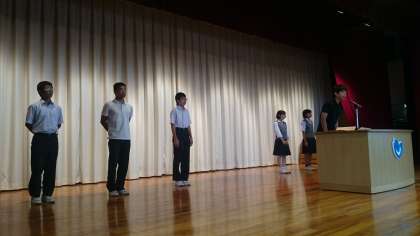 朝礼では、生徒会役員はじめ各専門委員長から、今、取り組んでほしい、気を配ってほしいことについて話がありました。