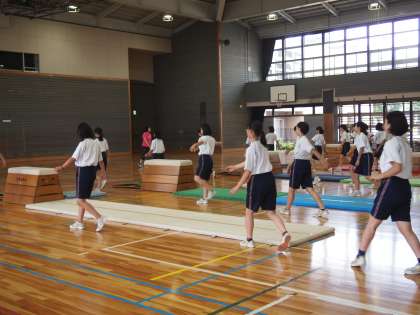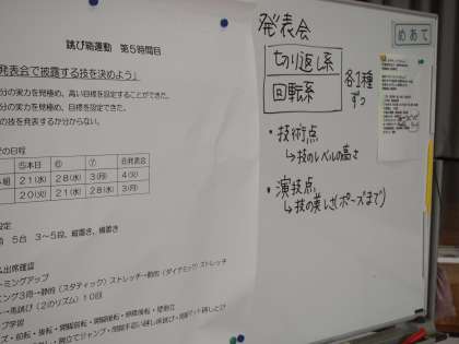 体育館では2年生体育の跳び箱の授業です。跳び箱の前にしっかりと準備運動をしています。前に置いてあるホワイトボードには、今日の授業のめあてや発表会に向けての注意事項などが示されています。