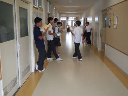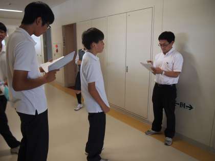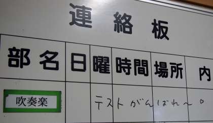 明日から期末考査が始まります。今日は最後の追い込みでみんな必死に勉強しています。三年生の英語は、暗唱テストの真っ最中。廊下で、各自がまるで演劇のセリフを覚えるように身振りをつけて頭に入れよう頑張っていました。そして、部活動の連絡ボードには、あたたかい励ましのメッセージが。明日からみんな全力で、頑張ってくださいね。