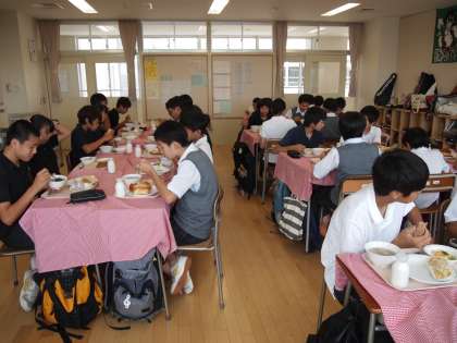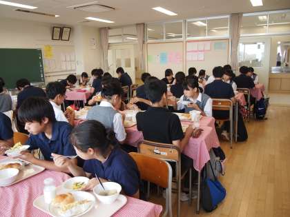 私(校長)が担任をしていた時には、給食終了5分前に「いただきます」をしたことが何度もありました。担任が「今日はいつもより時間がかかりました」と言っていましたが、今日の船橋希望中学校では授業が終了して15分後には全員着席して食事ができていました。本当にすばらしいことです。給食委員会の取り組み目標を達成できるよう、みんなが更に協力していけると、よりおいしく給食を食べることができますね。