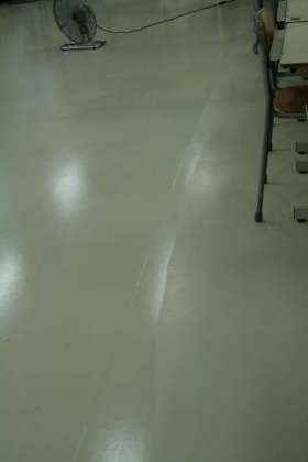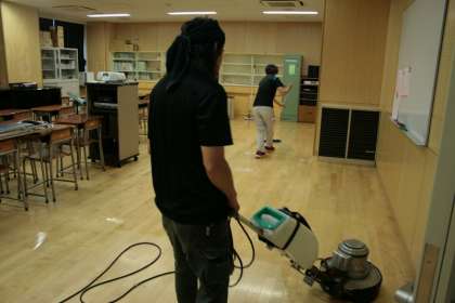 夏休み中を利用して校舎内のワックス掛けをしています。教室や特別教室、そして廊下など椅子や机などを脇によせ、汚れを落としてから順番にワックスをかけています。ワックスをかけたところは、明らかに光沢が違います。