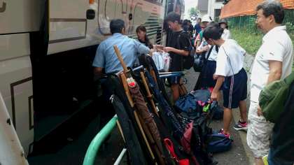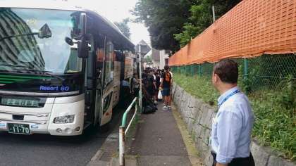たくさんの荷物を積み込み、8時45分に出発しました。(副校長)