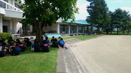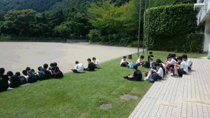 まずは昼食です。心地よい風が吹くなか、園庭で食べています。(副校長)