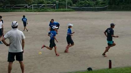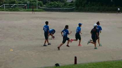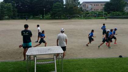 実践的な練習が始まりました。陸上競技部は400mを8本走っています。(副校長)