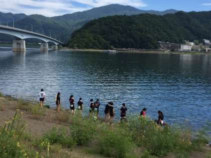 バレーボール部は休憩地点にて湖の風にあたっています。