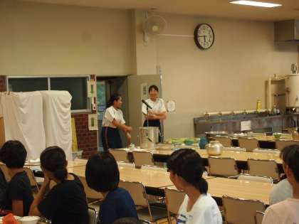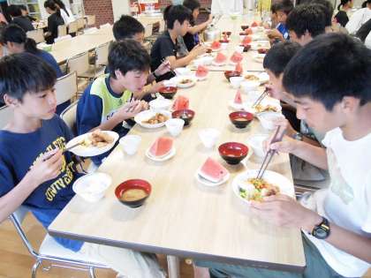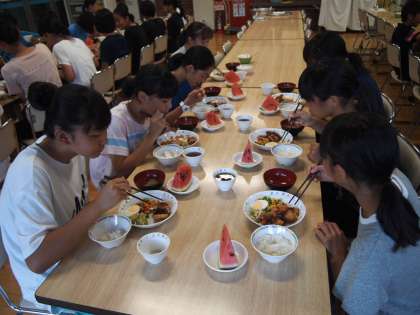「いただきます」の号令はバレーボール部のペアによる漫才からはいりました。夕飯は豚カツです。移動教室の時にはない部活動合宿だけのオリジナルメニュー。みんなモリモリ食べています。