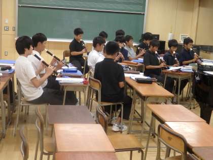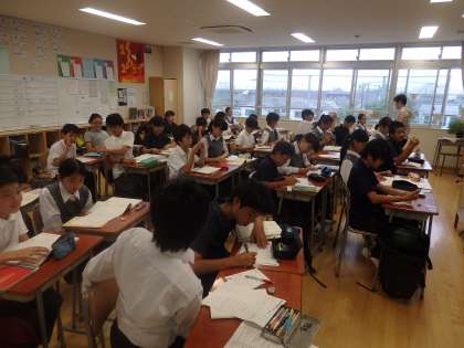 今日から2学期の授業が始まりました。1年生の授業の様子です。1組は国語で早速漢字テストを行っていました。日々の積み重ねが大切ですので、2学期も1回1回がんばりましょう。2組は英語の夏休み明けテストを行っています。どの生徒も真剣に取り組んでいます。3組は音楽のリコーダーテストを行っています。ギリギリまで練習を重ね、実技テストで100%実力を発揮できるようにがんばりましょう。(田村真)