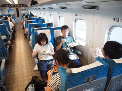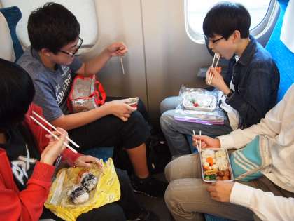 今日ののスケジュールはタイトなので、かなり早いお昼のお弁当を食べています。みんな朝御飯も食べてきたようですが、食欲旺盛であっという間に食べ終わっていました。間もなく京都に着きます。