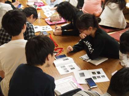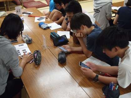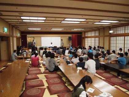 班長、副班長が大広間にあつまり、明日の班行動の注意点や、携帯電話の使い方などの説明を受けています。
