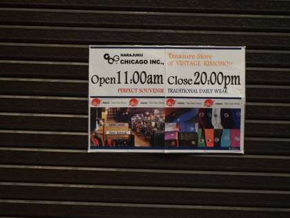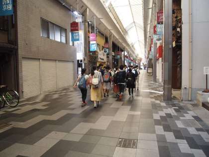 まずは体験学習です。扇子作りの体験先に同行しました。まだシャッターが降りている京極の商店街を通過。外国人観光客向けのお知らせがあちこちに。さすがに国際観光都市です。