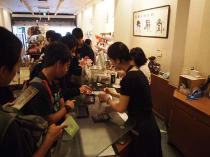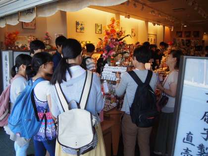 舞扇堂というお土産屋さんの二階が扇子づくり体験場所です。体験学習費も班毎に自分達で払います。