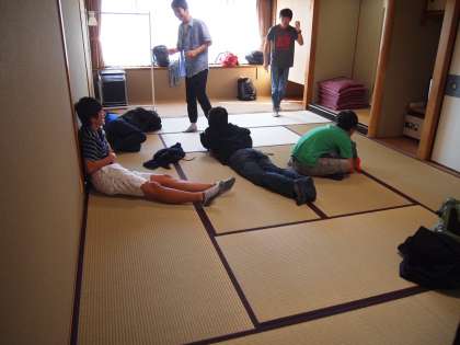 大きな荷物は先に宅配便で送ります。荷物はすべて廊下に出します。がらんとした部屋で最後にくつろいでいます。