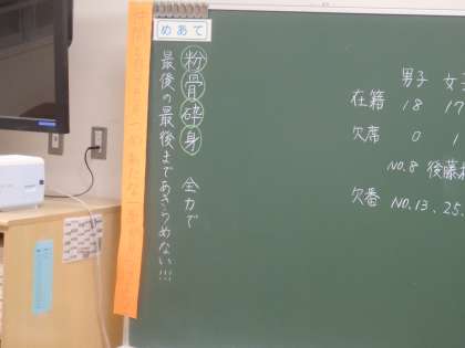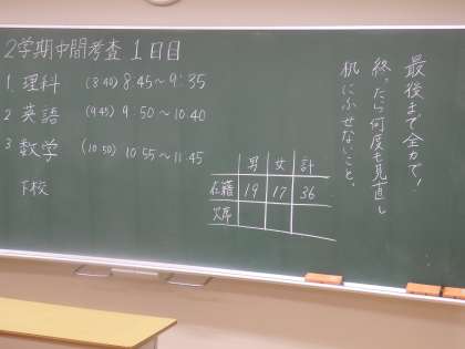 明日から中間考査が始まります。担任の先生方も、黒板にテストの時程とともに、それぞれ生徒たちへのメッセージを書いていました。テスト2日間、納得した結果が出せるように精一杯がんばりましょう。(田村真)