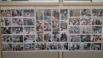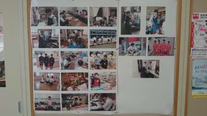 2年生のフロアの廊下には職場体験の写真が掲示されています。