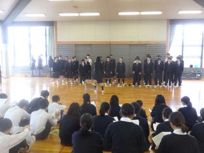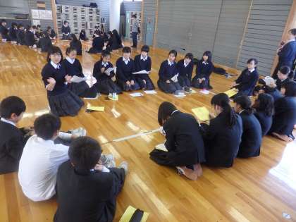 格技室でも、1・3年生が合同で合唱練習を行いました。3年生の合唱に対する姿勢、歌声、さすが船橋希望中の最上級学年だと感じました。最後の3年生の合唱は1年生に比べ、迫力もあり1年生は圧倒されていました。これをきっかけに、1年生は自分たちの合唱にもっと磨きをかけてください。(田村真)